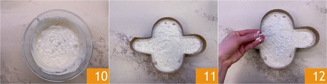 The batter should be smooth and homogeneous 10. Pour it into a 1 lb dove mold and level the surface with a spatula 11. Garnish with sugar sprinkles 12.