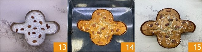 Finally, decorate with whole almonds 13 and bake in a preheated static oven at 375°F for 45 minutes. After this time, quickly open the oven, cover the dove with parchment paper on top, and continue cooking in ventilated mode for another 10 minutes. Do the toothpick test, and when the vegan dove cake is cooked, turn off the oven and leave it inside for 5 minutes with the oven open. After this time, take the cake out and wait for it to cool completely before cutting and serving it 15.