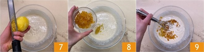 Flavor the batter with grated lemon zest 7 and diced candied oranges 8. Mix with a whisk 9.