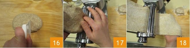 Once the dough has rested, take the dough and divide it into several pieces using a dough scraper 16. Using a pasta machine, roll the dough from the widest thickness 17 to the penultimate one 18, to obtain a sheet about 1/8-3/16 inch thick. Alternatively, you can use a rolling pin.