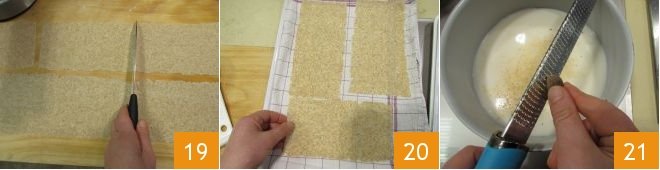 Gradually place the dough on a lightly floured surface, then cut it to obtain rectangles the right size for the baking dish. In our case, the pasta rectangles were 6x4.7 inches 19. Once the rectangles are obtained, place them on trays where you have placed clean cloths 20. Let the pasta dry slightly, and in the meantime, prepare the bechamel. Pour the rice milk into a saucepan, add the nutmeg 21, and bring it to a boil.