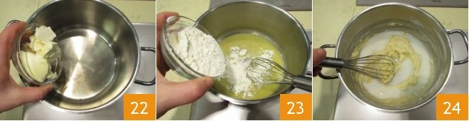In another saucepan, add the margarine 22 and let it melt gently. Once completely melted, add the flour while stirring 23 and mix quickly to obtain a lump-free mixture. Let it brown gently, then pour in the hot milk a little at a time 24.
