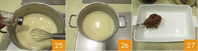 Season with salt and pepper 25, then continue cooking until your bechamel thickens 26. Place a pot full of water on the stove, salted to taste, which will be used for cooking the dough. Take a 12x8 inch baking dish and place a layer of ragù on the base 27.
