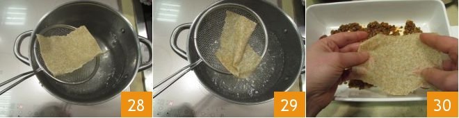 As soon as the water starts boiling, dip each pasta rectangle 28 and cook it for about 1 minute. Using a slotted spoon, drain it well from the cooking water 29 and place it on the ragù 30. Continue in this way until the entire surface is covered.