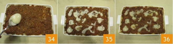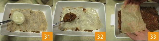 Add a layer of bechamel 31 and cover with more ragù 32. Continue this way, until you finish the pasta 33.