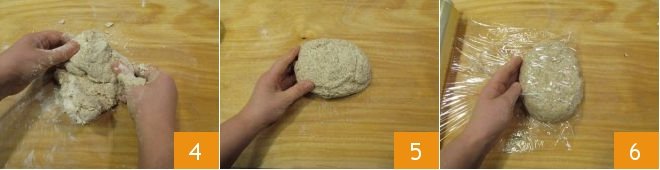 Continue working the mixture 4 until you obtain a smooth and homogeneous dough 5. At this point, wrap it in plastic wrap 6 and let it rest for an hour at room temperature.