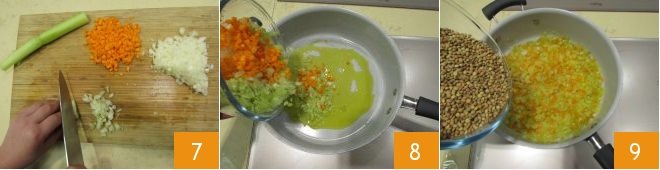 In the meantime, prepare the lentil ragù. Clean and finely chop the carrots, celery, and onion 7; then add them to a pot with the oil 8 and let them brown over moderate heat for about ten minutes. Once golden, add the previously rinsed dry lentils 9.