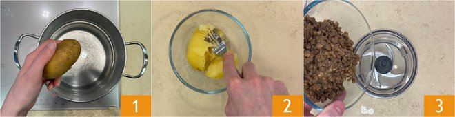 To prepare the vegan meatloaf, start by boiling the potato with its skin 1. After about 30/40 minutes, it should be cooked, so peel it and mash it with a fork 2. In the meantime, pour the pre-cooked lentils into the blender cup 3.