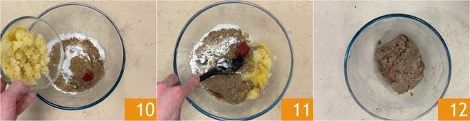 At this point, add the boiled potato 10, season with salt and pepper, and mix well with a spatula 11 until it reaches the right consistency 12.