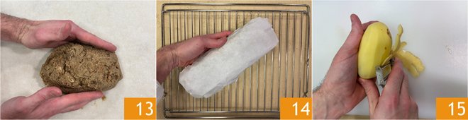 Transfer onto a sheet of parchment paper and shape the mixture into the classic meatloaf shape 13. Wrap it like a candy and let it rest in the fridge overnight. The next day, place it on a rack and bake in a preheated static oven at 430°F for about 40 minutes 14. If you want, you can accompany it with roasted potatoes. After washing, peel them 15.