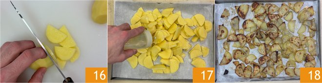 Cut them into half-moons 16, then place them on a baking tray lined with parchment paper, season with oil and salt 17, and bake (also with the meatloaf, same temperature and cooking time) 18.