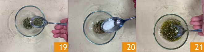 Prepare the seasoning: in a bowl, pour thyme and rosemary 19, add salt 20 and oil, and mix 21.