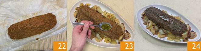 At this point, the meatloaf is cooked 22, brush the surface with the freshly prepared seasoning 23 and serve your vegan meatloaf with potatoes 24.