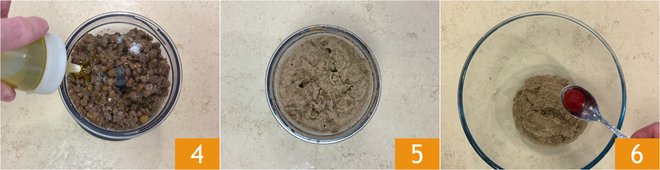 Add salt, oil 4, and blend well 5. Transfer the cream to a bowl and add the other ingredients. Start with the tomato paste 6.