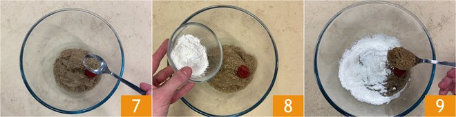 Then the aromatic herbs 7, the tomato paste, and the cornflour 8, and finally the ground flax seeds 9.