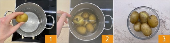 To prepare the vegan sausages, start by cooking the potatoes. Immerse them in cold water 1 and count about 40 minutes from boiling. When you can easily pierce them with a fork 2, they are ready. Set them aside in a bowl until use 3.