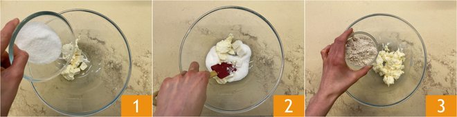 To prepare the vegan shortcrust pastry, start by working the vegan butter and the sugar in a bowl 1, soften well 2 and then add the type 1 flour 3.