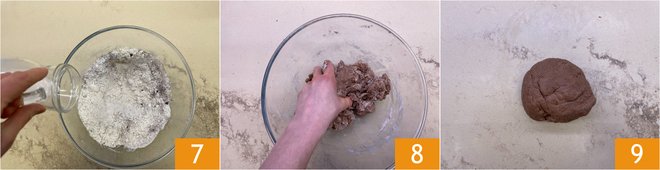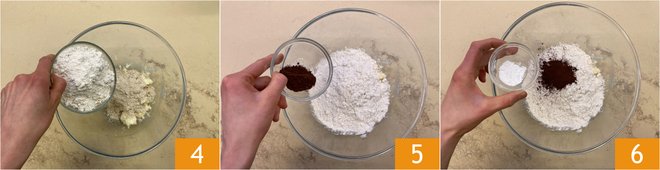 Also add the chestnut flour 4, the cocoa 5, a pinch of salt and the baking powder 6.