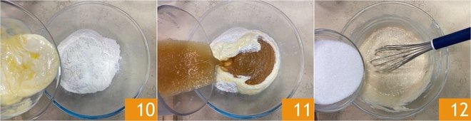 Pour the flour into a bowl and add the plant-based butter, which you will have melted earlier 10, and the apple puree 11. Mix well with a whisk, then add the sugar 12.