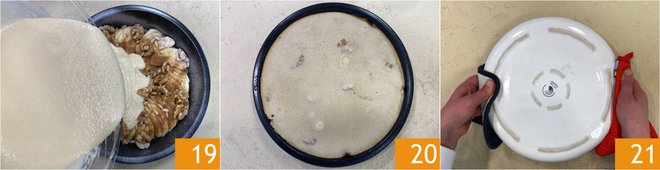 At this point, cover the apples with the batter 19 and bake in a preheated static oven at 356°F for about 45 minutes 20. Check the baking with a toothpick, then take it out of the oven and immediately flip the cake with the help of a plate, being careful not to burn yourself 21.