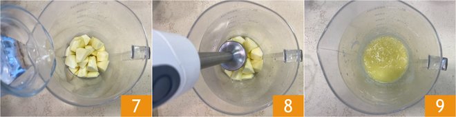 Transfer the apple chunks into a jug, add the water 7, and blend with an immersion mixer 8 to obtain a puree 9.