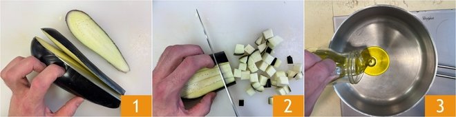 To prepare your vegetable caponata, start by slicing the eggplants lengthwise first 1 and then into cubes 2. Pour oil into a large saucepan 3.