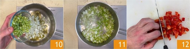 Cut the celery 7 and onion 8 into cubes. In the same pan, add the onions 9.