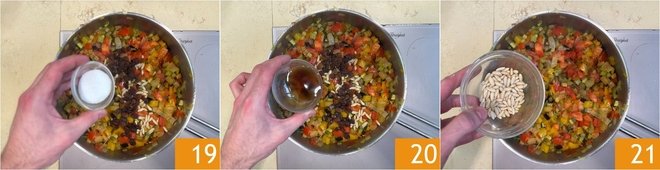 Season with sugar 19, red wine vinegar 20, and add the pine nuts 21.