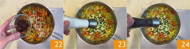 All that's missing is the raisins previously soaked in hot water 22, season with a pinch of salt 23 and a grind of black pepper 24