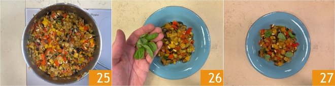 Cook for another 10 minutes on low heat to allow all the flavors to amalgamate and blend together 25. Fragrance and color with fresh basil 26. Your vegetable caponata is ready to be served! 27