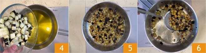 When the oil is hot, add the eggplants 4. Cook them over medium heat for about 10 minutes 5, once golden, remove them from the saucepan 6 and set them aside.