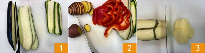 To prepare the vegetable flan in the microwave, first cut the eggplants lengthwise into slices 3/4 inch thick 1. Also slice the bell pepper, removing the seeds and internal filaments, and the potatoes into rounds about 3/8 inch thick 2. Cut the provolone into regular slices as well 3.
