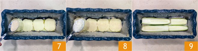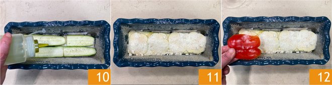 Neatly arrange the provolone slices on the eggplants, sprinkle with breadcrumbs 7, and add the grated Parmesan cheese 8. Arrange the zucchini as well 9.