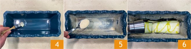 Butter a 10.5x4 inch mold 4 and sprinkle with breadcrumbs 5. Place the eggplants at the bottom, add a drizzle of oil, and season with salt and pepper 6.