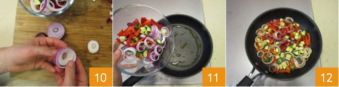 Separate the onion rings 10; heat a drizzle of oil in a pan, then add the vegetables 11. Sauté over high heat for 1-2 minutes, seasoning with salt and tossing often to avoid burning 12. Transfer to a bowl and let cool slightly.