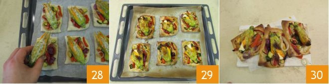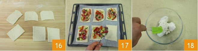 you should get 6 16. Transfer them to a baking sheet lined with parchment paper. Garnish each rectangle with some of the sautéed vegetables 17 and bake in a preheated static oven at 430°F for 15 minutes. Meanwhile, work the ricotta with a spatula and transfer it to a piping bag 18.