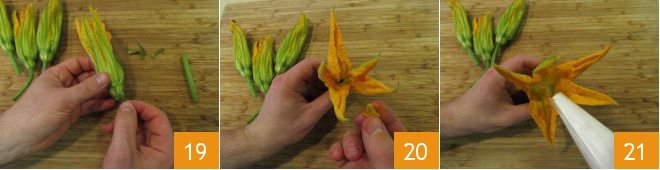 Then proceed with cleaning the zucchini flowers: remove the stem, the peduncles at the base of the flower 19, and the pistil inside 20. Fill the flowers with the ricotta 21,