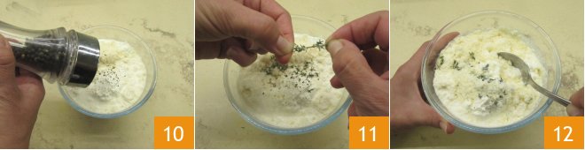Season with salt, pepper 10, and thyme leaves 11, then mix well 12.