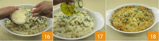 Sprinkle the surface with grated Grana 16, drizzle with olive oil 17, and bake in a preheated fan oven at 350°F for about 25 minutes, then turn on the grill for another 5 minutes. Once cooked, your vegetarian baked pasta is ready to be served hot 18!