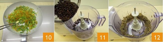 Once cooked, remove the garlic clove 10 and let the vegetables cool slightly. At this point the chickpeas will be cool: put them in the jar of a food processor 11 and blend them until they become a powder 12.