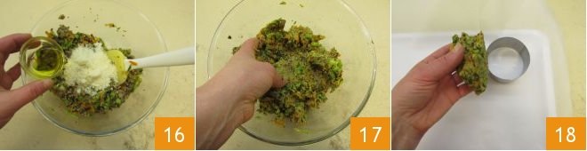 Then add about 2 1/4 tsp of oil 16, mix first with a spatula and then work the mixture with your hands 17 until you obtain a compact dough 17. Take 1/4 of the mixture (about 3.5 oz / 100 g) and place it inside a 3 in diameter ring mold 18.