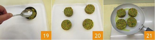 Using the back of a spoon press the mixture 19 to compact it. Repeat the same operation until you form all 4 vegetarian burgers. At this point heat a pan, add the remaining oil and use it to cook the burgers. Once placed 21 wait about 2–3 minutes until a golden crust forms.