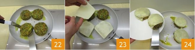 Only now can you flip them using two spatulas 22 and finish cooking on the other side for another 2 minutes. Once flipped, also add a slice of cheese on top of each burger 23, this way the cheese will melt just right. Once cooked move the burgers to a plate 24.