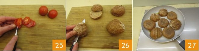 Slice the tomatoes 25, then take the buns, split them in half 26 and toast them for a few moments in the pan, just long enough to make them crispier, with the crumb side facing down 27.
