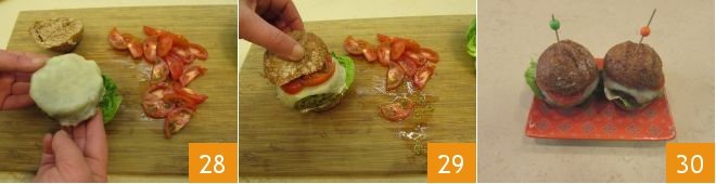 At this point all you have to do is assemble your vegetarian burger: place a lettuce leaf on the bottom of the bun, then place the vegetarian burger 28, the tomato slices seasoning them lightly with salt, and close with the top of the bun 29. Serve your vegetarian burgers 30 while still hot to fully enjoy their flavor!