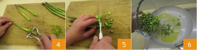Meanwhile, take care of the asparagus. First cut off the woody ends, then peel them 4 and slice into rounds 5; you can use the peels to make a mineral-rich vegetable broth. In a pan pour about 1 1/2 tbsp of oil, add a clove of garlic and let it turn golden. Then add the asparagus 6, lower the heat and let them cook for 5–6 minutes over low heat.