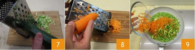 Meanwhile grate both the zucchini 7 and the carrot, peeled and trimmed beforehand 8, using a coarse grater. After the 6 minutes of cooking the asparagus, add the carrots and zucchini to the pan as well 9. Salt, pepper and cook everything for another 7–8 minutes until the vegetables are very tender.