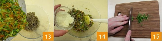 Transfer the chickpea purée into a bowl, add the warm vegetables, the grated Grana Padano 14 and the chives finely chopped 15.