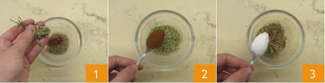 To make the vegetarian kebab, first prepare the seasoning mix by mixing all the ingredients in a small bowl: cumin, sweet paprika, dried oregano 1, hot paprika 2, salt 3, and pepper.