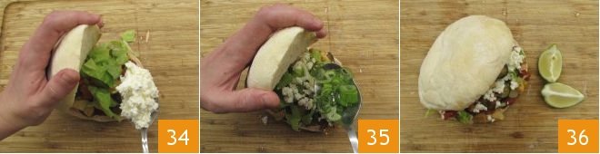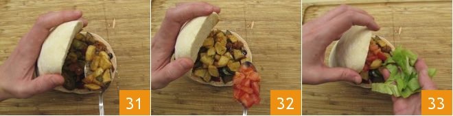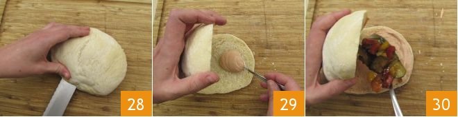 At this point, you are ready to assemble the sandwich: cut the pita bread into pockets 28 and spread the bottom half with plenty of sauce 29, then fill with the cooked vegetables 30,